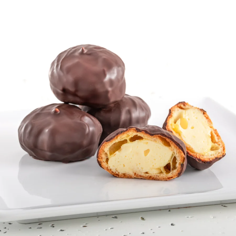 Ciasto parzone wypełnione kremem budyniowym z dodatkiem adwokatu oblane czekoladą.