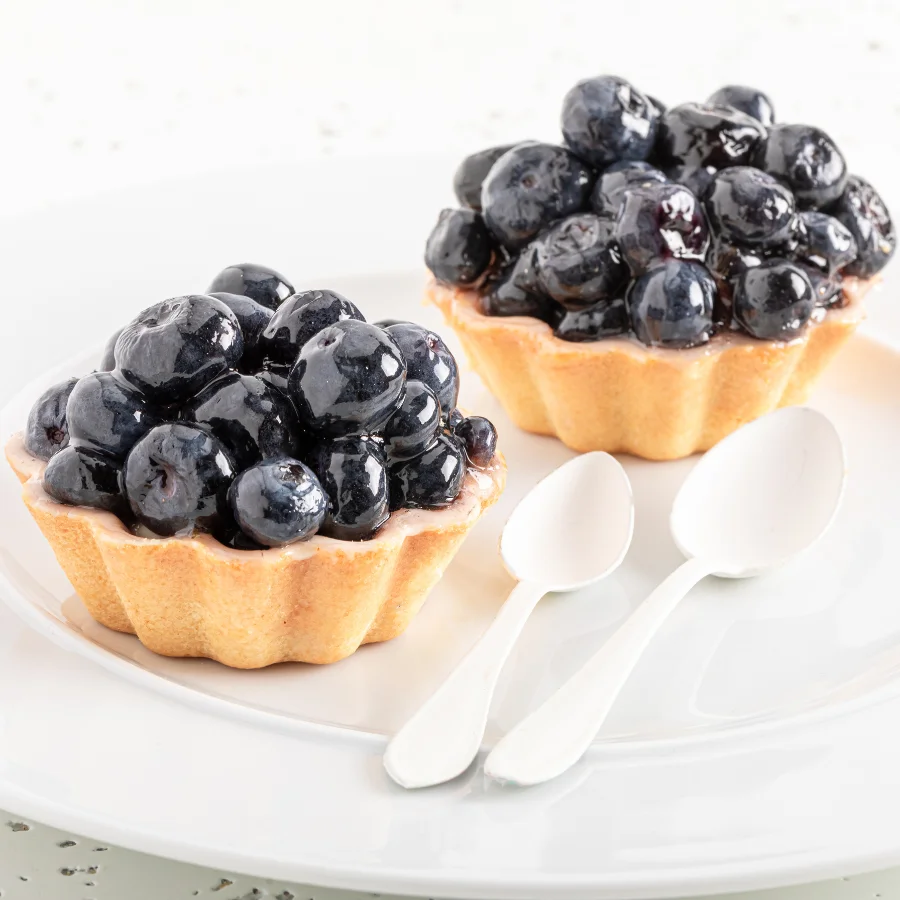 Babeczka z ciasta kruchego wypełniona kremem budyniowym o smaku waniliowym z świeżymi borówkami. Produkt sezonowy (lato).