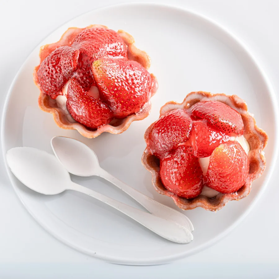 Babeczka z kruchego ciasta wypełniona kremem budyniowym o smaku waniliowym z dodatkiem świeżych truskawek. Produkt sezonowy (lato)