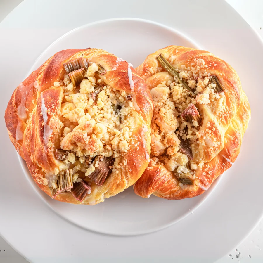 Puszyste ciasto drożdżowe z rabarbarem, udekorowane kruszonką i lukrem.