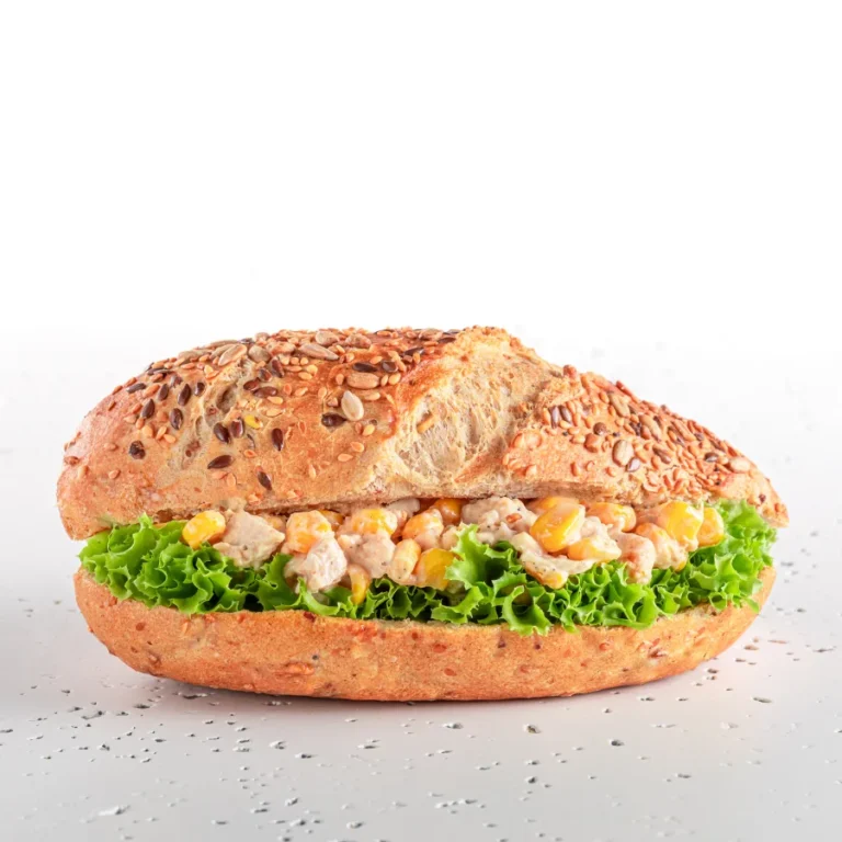 Kanapka w bułce wieloziarnistej z kurczakiem i kukurydzą, sałatą i majonezem.