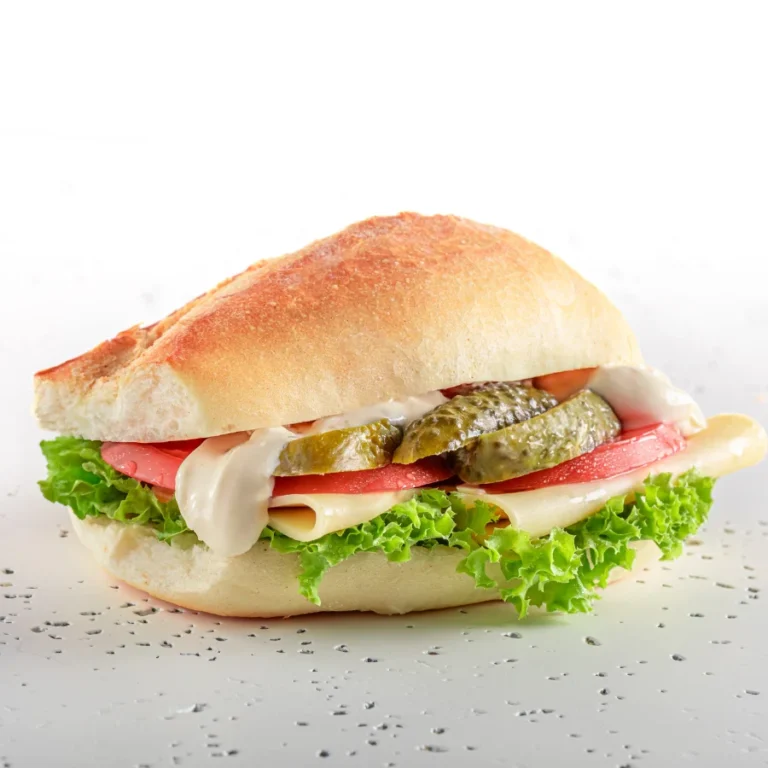 Kanapka z serem, sałątą, ogórkiem konserwowym i pomidorem w bułce pszennej.
