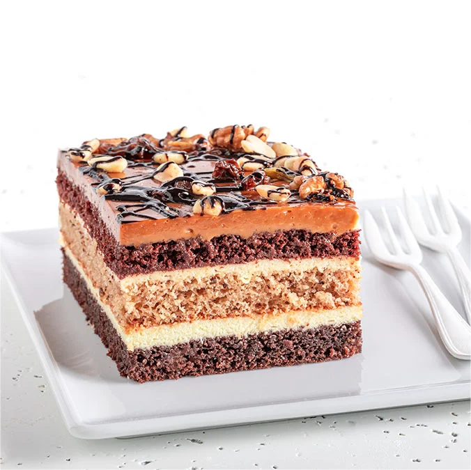 Ciasto orzechowe przełożone kremem budyniowym i kajmakiem z dodatkiem mieszanki orzechów i bakalii.