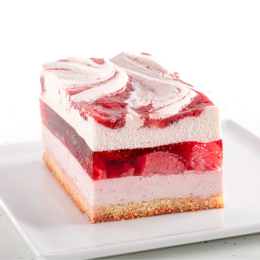 Delikaty biszkopt przełożony musem truskawkowym oraz warstwą galaretki z truskawkami.