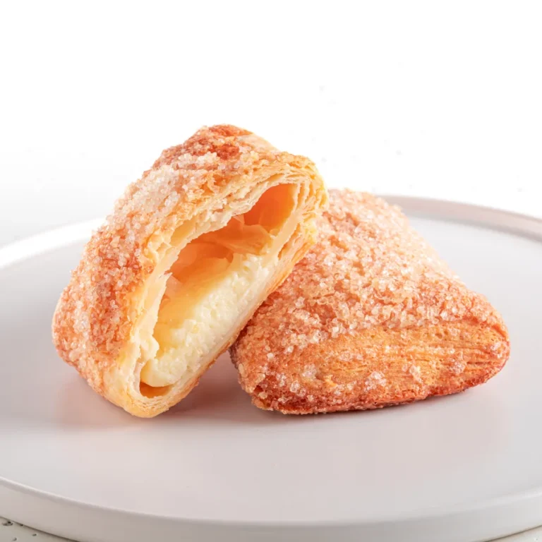 Ciastko francuskie nadziane twarożkiem waniliowym, posypane kryształkami cukru.