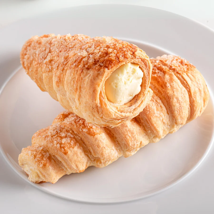 Ciasto francuskie nadziane kremem budyniowym o smaku waniliowym, posypane cukrem.