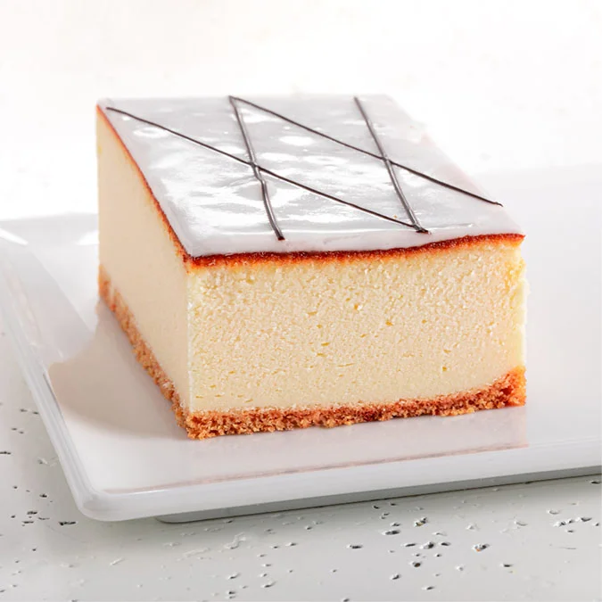 Puszysty sernik na kruchym cieście udekorowany lukrem.