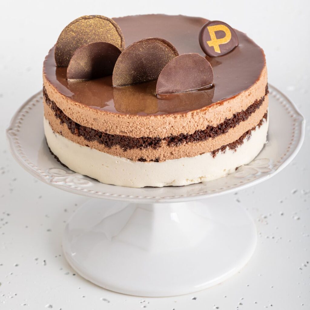 Delikatne ciasto czekoladowe przełożone warstwą chrupiącej mlecznej prażynki, kremem na bazie musu orzechowego i czekoladowego.