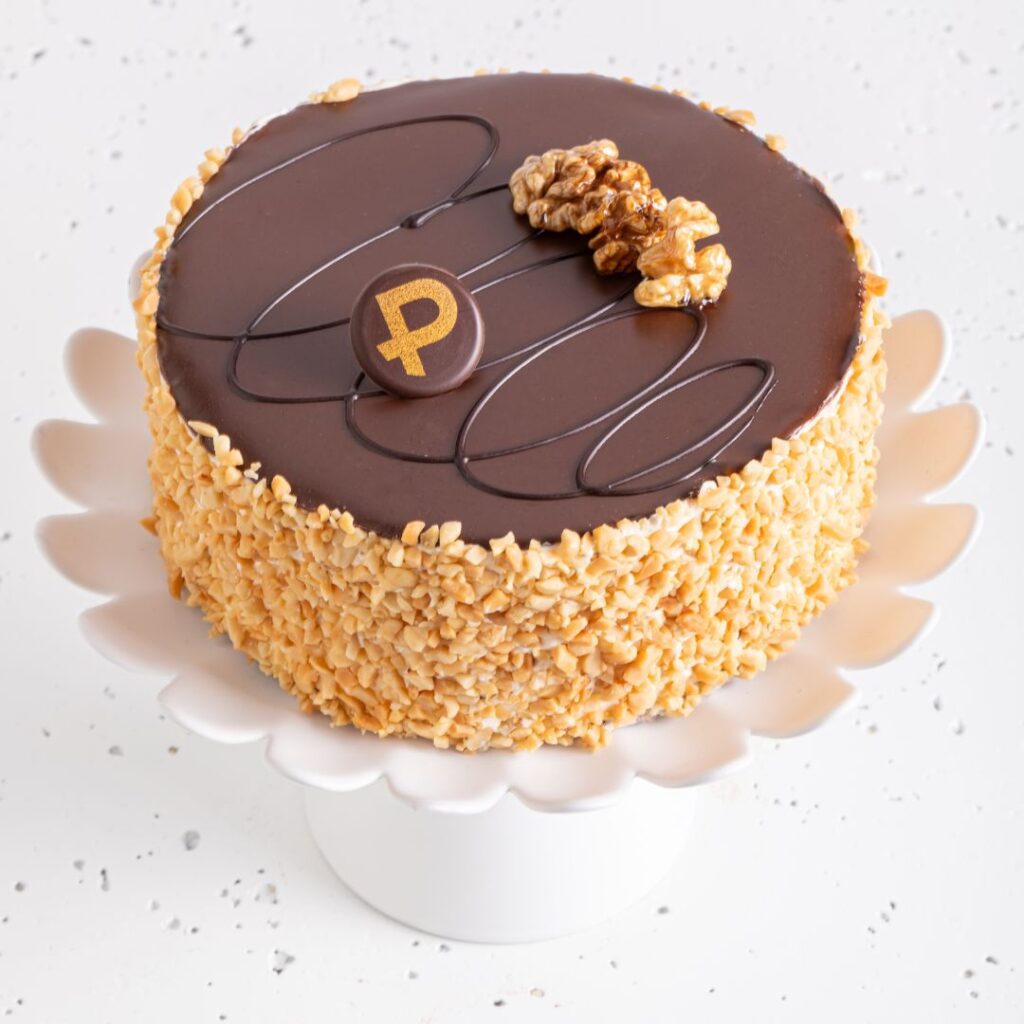 Delikatny biszkopt i warstwa bezy z pysznym kremem orzechowym z dodatkiem alkoholu.